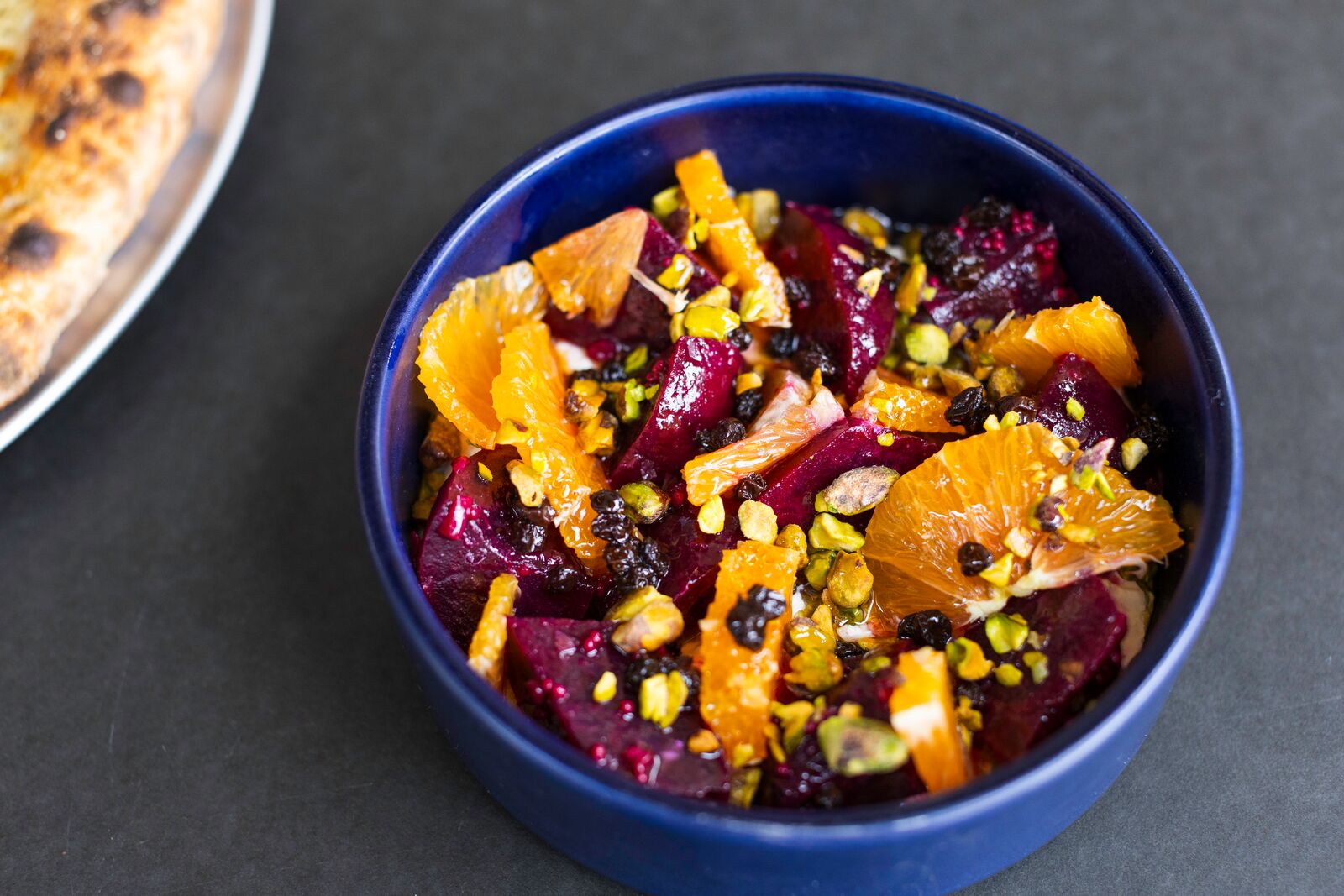 The menu at Flour + Water Pizza Shop includes chicken wings (top) made with a spice blend from Oaktown Spice Co. and a beets and citrus salad (bottom). Credit: Estefany Gonzalez for East Bay Nosh