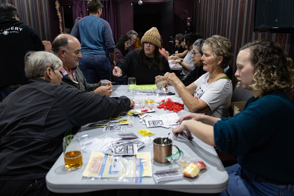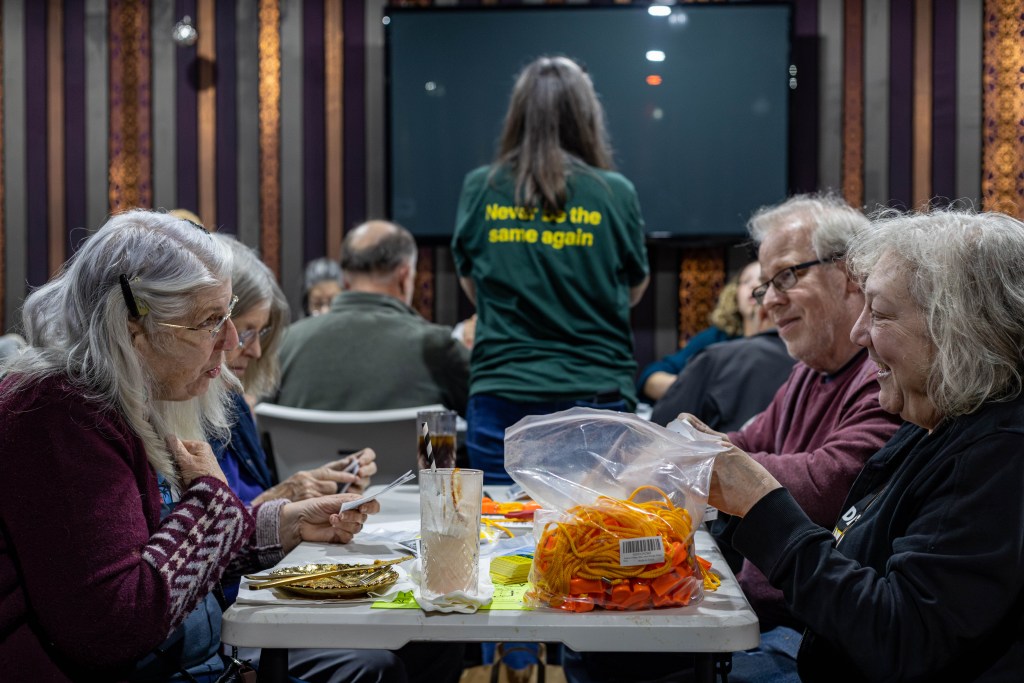 Long Beach residents attend Whistlemania’s Make Whistle Packs event on Jan. 20, 2026 at The Wicked Wolf, where they help create and package whistle packs to send out across Long Beach. (Samuel Chacko | Signal Tribune)