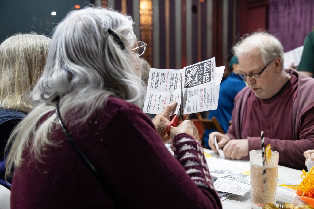 Members of Long Beach Indivisible help facilitate the Make Whistle Packs at The Wicked Wolf on Jan. 20, 2026 where they show volunteers how to cut, fold and package whistle packs. (Samuel Chacko | Signal Tribune)