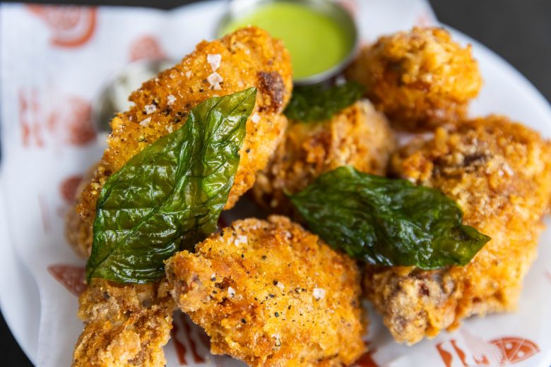 Like their other shop, the Oakland shop has a few items that pay homage to local flavors. The Mission Bay location has Gilroy garlic fries, for example, inspired by the stadium fries. The Oakland shop serves chicken wings seasoned with an Oaktown Spice Co. spice blend. The wings are dipped in an aquafaba, gluten-free batter made of chickpeas and rice flour, and fried twice. The highlight is the dipping sauce, inspired by The Cheese Board Collective in Berkeley and other East Bay pizza shops’ “green sauce.” Theirs is made with cilantro, garlic, chiles, and limes, and makes a really fine dipping sauce for all of their dishes, from the wings to the meatballs. They also serve a Kölsch German-style beer, a collaboration with Temescal Brewing.
