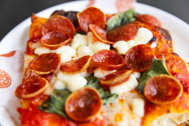 Flour + Water Pizza Shop offers a “big slice” a single, square-shaped pizza slice. Credit: Estefany Gonzalez for East Bay Nosh