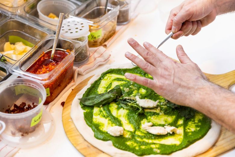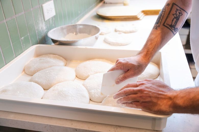 As for the pizza dough, it’s produced in the central kitchen in North Beach, using a blend of organic grains from Central Milling, based in Petaluma, and cold-fermented for several days.