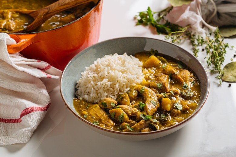 Moroccan chicken braise with white rice, kabocha squash, and a pot of braise. (Photo courtesy of Urban Plates)