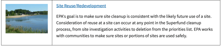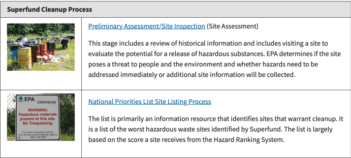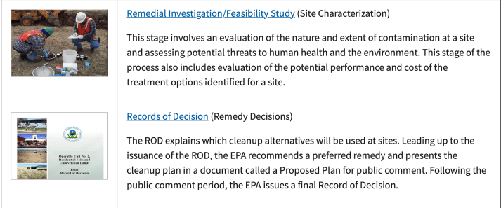 Cleaning up Superfund sites is a complex, multi-phase process. The contents of this page are provided to help you learn how the cleanup process works and to find opportunities for community involvement. Click links at each phase of the process for more information.