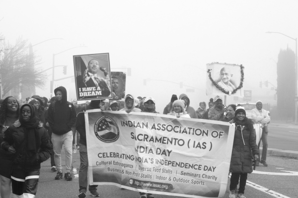 Many local organizations joined the walk and showed support. One organization was the Indian Association of Sacramento who held a banner of their information as well as holding signs featuring Martin Luther King Jr. and Indian freedom fighter Mahatma Gandhi. (Kadreanna Walker)