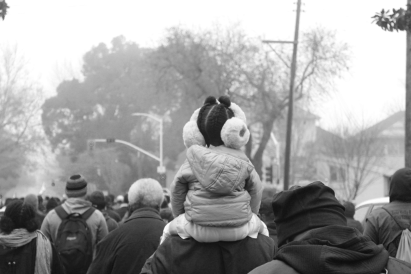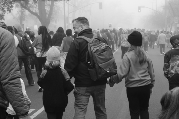 Father leads daughters through the streets of Sacramento as they participate in a march on Martin Luther King Jr. Day. (Kadreanna Walker)