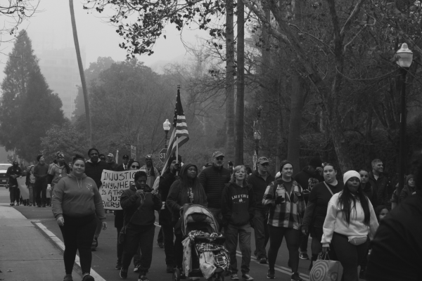 Marchers reached the finish line, having completed the nearly five-mile walk from Sacramento City College, passed the Capitol building and ended at the Safe Credit Union building. They held the American flag and a sign that said “Injustice anywhere is a threat to justice everywhere.” (Kadreanna Walker)