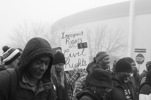 Community members marched through Sacramento together, some holding handmade signs. One sign says “Immigrant rights are civil rights.” (Kadreanna Walker)