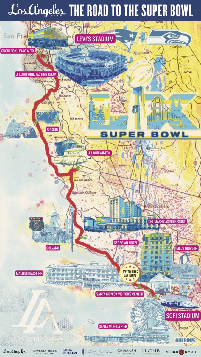 Special thanks to my co-pilot, Madison Brodsky, and video and photo virtuoso Saul Padilla for joining us on the road trip with a camera, drone, and good attitude. I also want to thank acclaimed L.A. artist, Guerin Swing, whose custom map brings this journey to life for our readers. Guerin created our Fire covers from last February, along with our “Best of LA” cover. I also want to thank Beverly Hills Car Rental for providing us with a beautiful vehicle to use. Follow us on our Instagram: @LAMAG over the next two weeks as we share our stories on our stops along the way. We will also be showcasing a final static video on Super Bowl Sunday. Join us for many more Road series adventures, coming this year from Los Angeles Magazine.