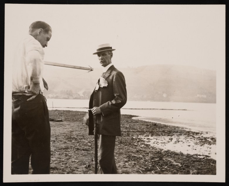 Smithsonian Institution Archives, Record Unit 95, Box 27F, Image No. SIA_000095_B27F_156. Dr. Albert F. Zahm / At Hammondsport, N.Y., during tests of large Langley plane, in May and June, 1914. / Glenn H. Curtiss (left) Photo courtesy of the Smithsonian Institution Archives/public domain)