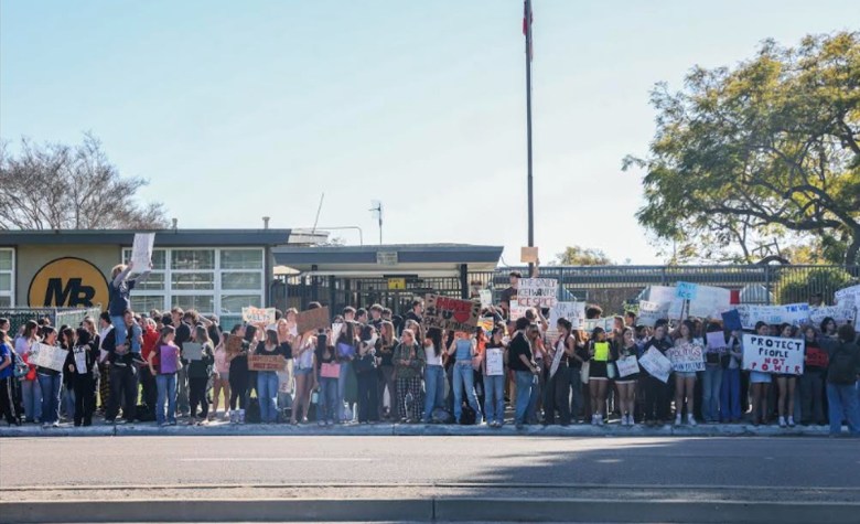 Students outside Mission Bay High School participate in a walkout on Jan. 30, 2026. (Photo by Adrian Childress/Times of San Diego)