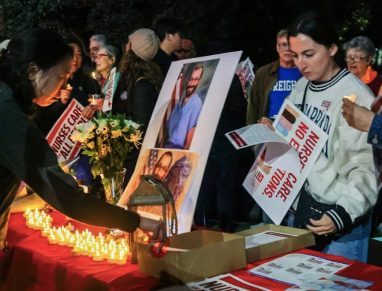 Outside the VA hospital in La Jolla on Jan. 29, 2026, nurses and staff honor slain nurse Alex Pretti. (Photo by Adrian Childress/Times of San Diego)
