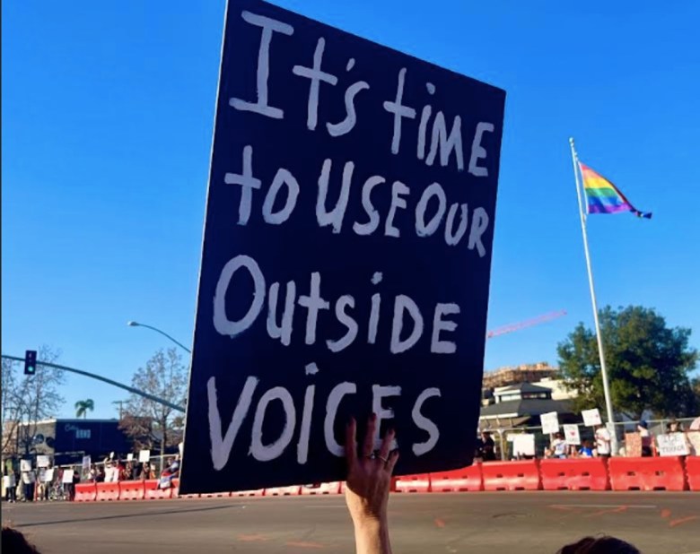 In Hillcrest, the hour-long protest began at 3 p.m. on University Avenue at Normal Street and attracted around 350 people. They lined both sides of the street near University and Normal Street, chanting “This is what democracy looks like!” and “ICE must go!”