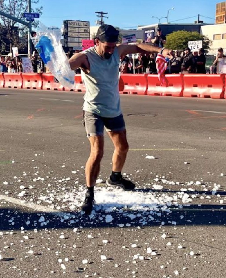 A man smashing a bag of ice in the middle of University at Normal Street made a symbolic gesture that generated roaring applause from protesters lining both sides of the street on Jan. 30, 2026 in Hillcrest. (Photo by Frank Sabatini Jr./Times of San Diego)