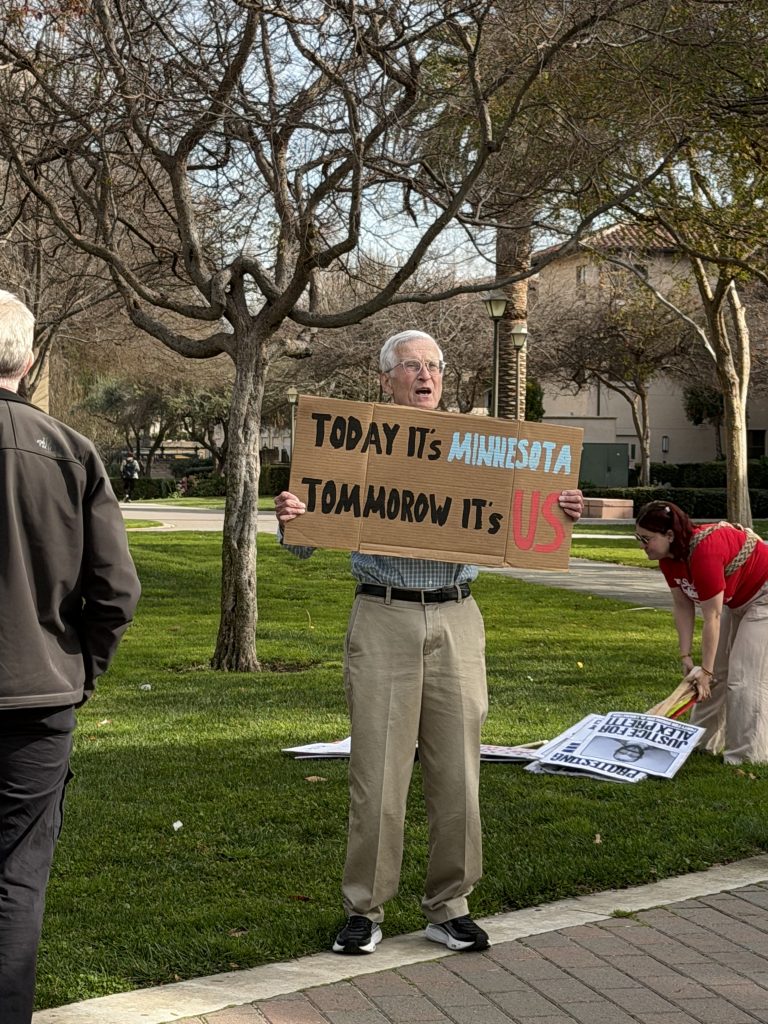 It was not just students in the crowd, but also faculty and community members. Mike Sage, a Santa Clara resident, arrived early and sang “We Shall Overcome,” as people began to arrive.