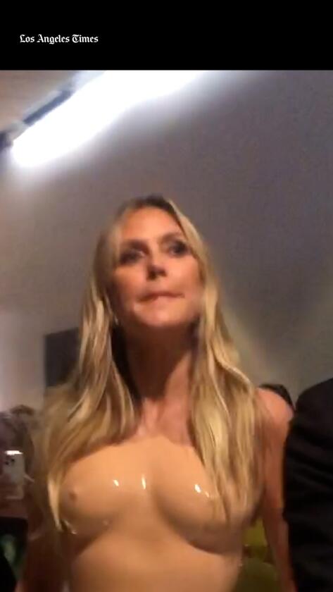 Supermodel Heidi Klum turned heads inside the arena as she tottered along like an unsteady child inside a strange nude-colored latex dress that resembled a naked body with nipples and pronounced buttocks. The garment did not bend or move, which greatly reduced Klum’s ability to get around. It was more like a suit of armor than a dress, and the parade of onlookers following behind her made a game of guessing how Klum might sit down during the ceremony. The answer soon arrived when Klum swapped the dress for a slinky black number. — J.G.