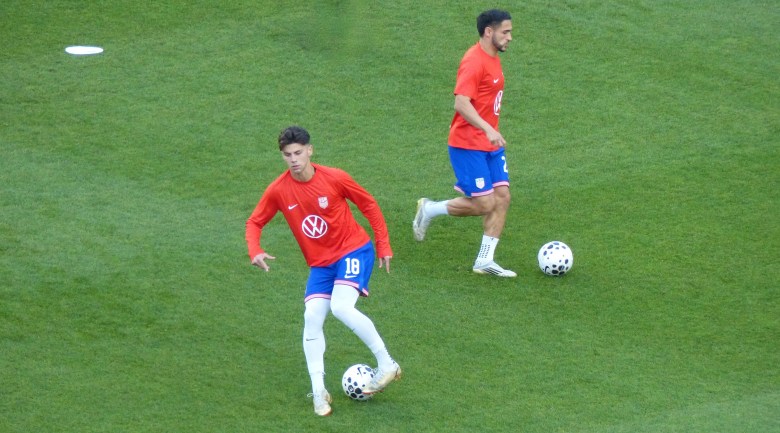 Max Arfsten (left) and Cristian Roldan warm up ahead of their starts against Japan last September. Arftsen’s cross set up Alex Zendejas’ goal in the 2-0 win. (Photo: Mike Woitalla)