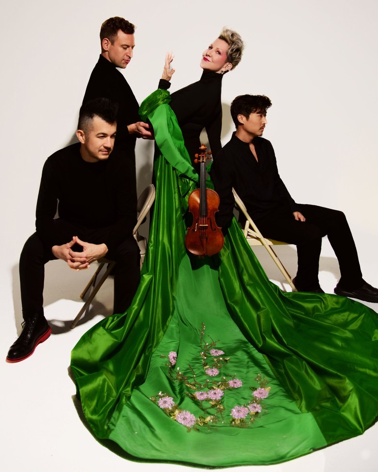 Mezzo soprano Joyce DiDonato and string-vocal trio Time for Three appear in “Emily —No Prisoner Be,” a Cal Performances commission, in UC Berkeley’s Zellerbach Hall. (Shervin Lainez/Cal Performances via Bay City News)