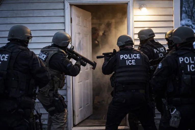 Illustration depicts federal immigration officers conducting a forcible home entry during an enforcement operation. The image is a visual representation and does not depict an actual ICE raid or a specific individual or location.