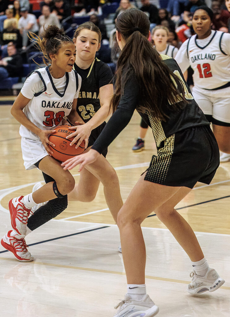 Oakland Middle’s Jewels Jones is bottled up by the Upperman defense of Ella Davis and Emery South during their sectional game at Oakland Saturday. JIM DAVIS