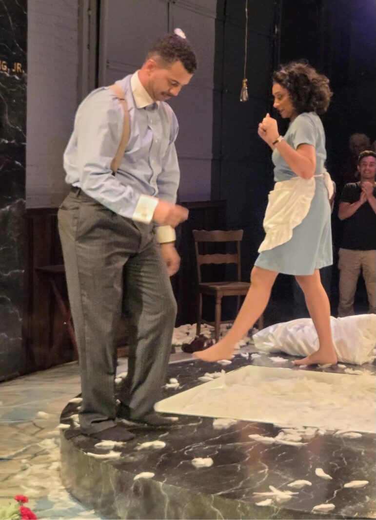 Interestingly, the centerpiece of the set is not a bed. In program notes, OTP artistic director Moran says, “The play is set in the Lorraine Motel, but it is also set atop [MLK Jr.’s] grave. As a result, we have chosen to set the play within his tomb. … This man of freedom cannot free himself from death when it comes knocking.”