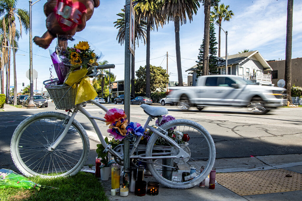 A roadside memorial honors a woman who was riding her bicycle when she was struck and killed by a speeding hit-and-run driver on Saturday at the intersection of Redondo Avenue and Second Street in Long Beach, Monday, Feb. 9, 2026, Photo by Thomas R. Cordova.