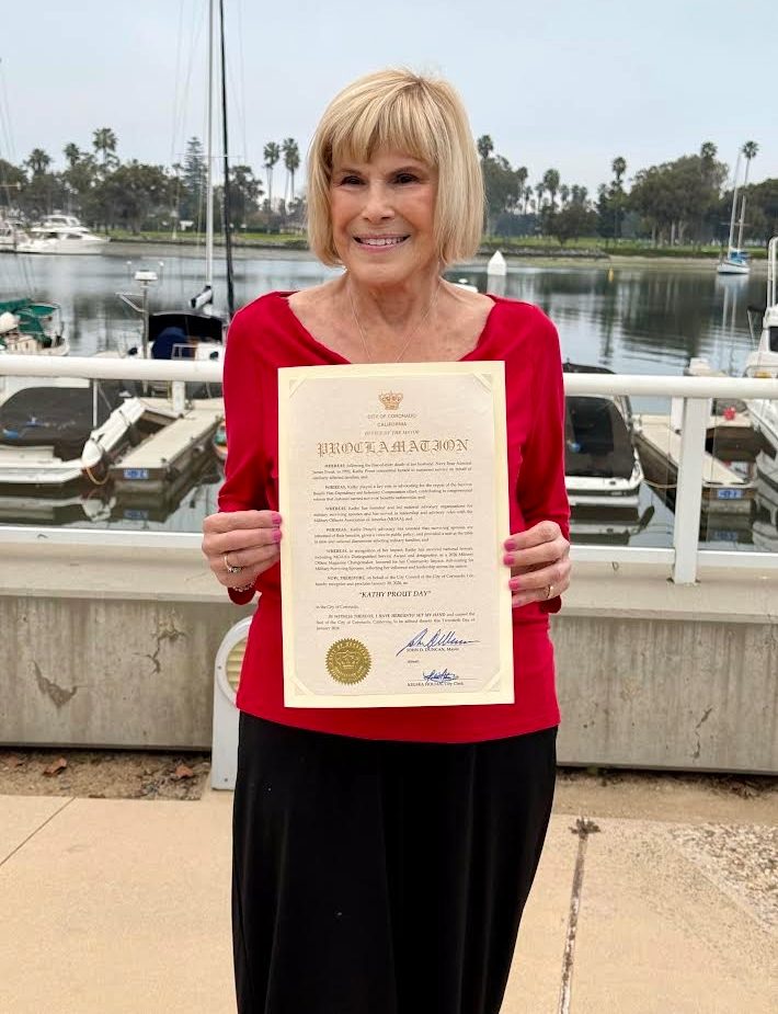 Last month, Kathy received a proclamation from the Coronado City Council designating January 20, 2026 as “Kathy Prout Day” in recognition of recently being named a 2025 MOAA Changemaker for Community Impact. She earned this honor because of her decades of dedicated work advocating for military surviving spouses and as a founder and board member of Gold Star Spouses of America, Inc. (GSSA). GSSA is a non-profit organization supporting both longstanding and newly bereaved surviving spouses of veterans and active duty service members who either died in the line of duty on active duty or of a military service caused illness or injury.