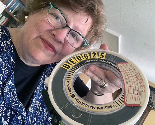 Glusker holds a data storage device used in the 1980s by UC Berkeley’s Sociology Department. (Photo by Ann Glusker)
