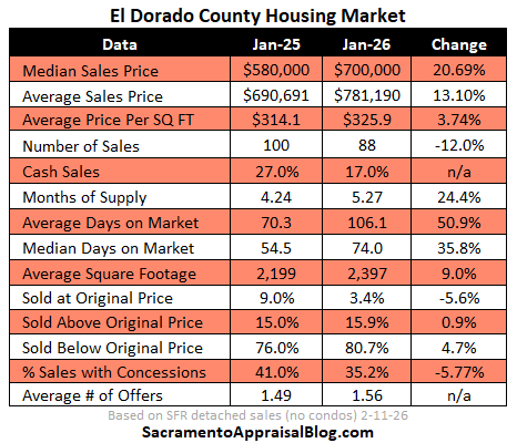 El Dorado is truly wonky this month. The wrong narrative is to say, “The market is up by 20%.” This is the problem with having about one hundred sales that can vary from acreage to super high end.