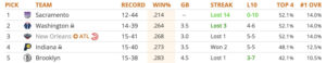 The three teams with the worst records each have a 14 percent chance to win the No. 1 overall pick, with odds decreasing incrementally by record.