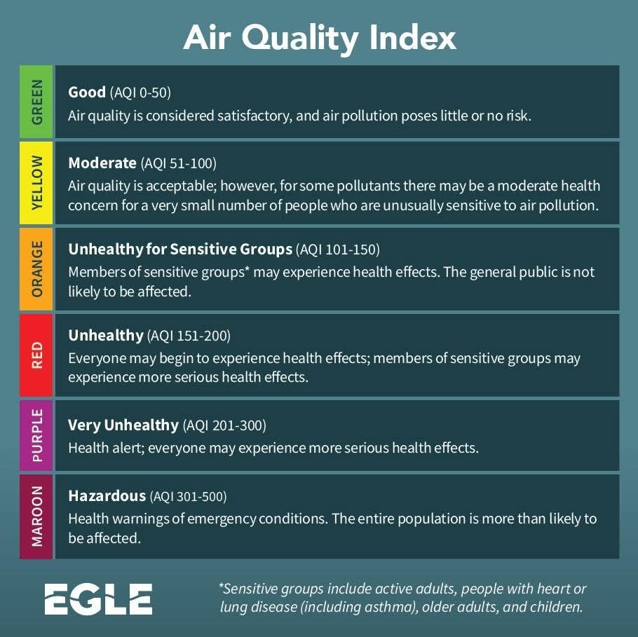 Air quality is an important measure identified in SEMCOG plans and programs for creating desirable communities, protecting public health, and maintaining a positive regional image for Southeast Michigan. In partnership with the Michigan Department of Environment, Great Lakes, and Energy (EGLE), SEMCOG is now implementing a two-tiered system of Air Quality Advisories and Air Quality Alerts. This new system is based on the EPA’s U.S. Air Quality Index (AQI).