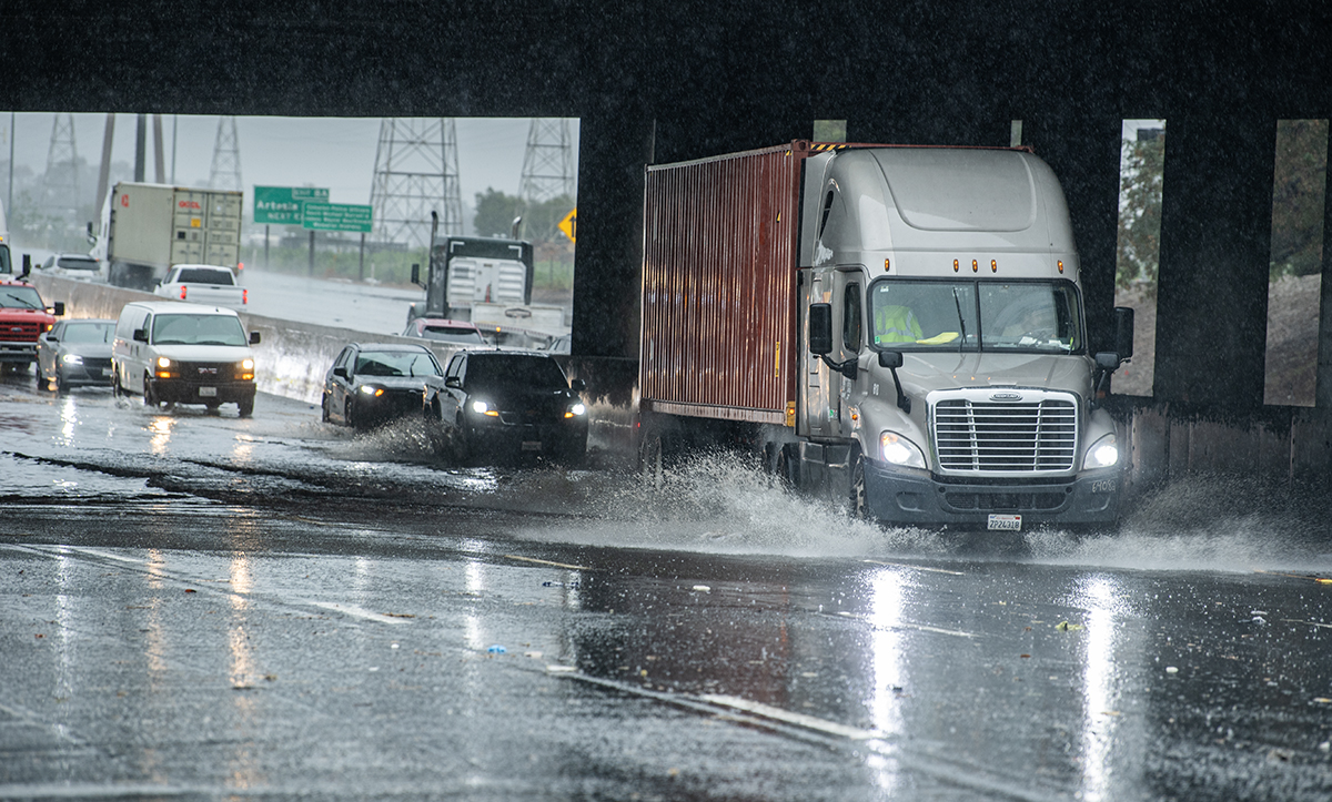 A tractor-trailer drives through high water on the 710 Freeway, where only one lane was open under Long Beach Boulevard during a rainstorm in Long Beach on Monday, Feb. 16, 2026. Photo by Thomas R. Cordova.