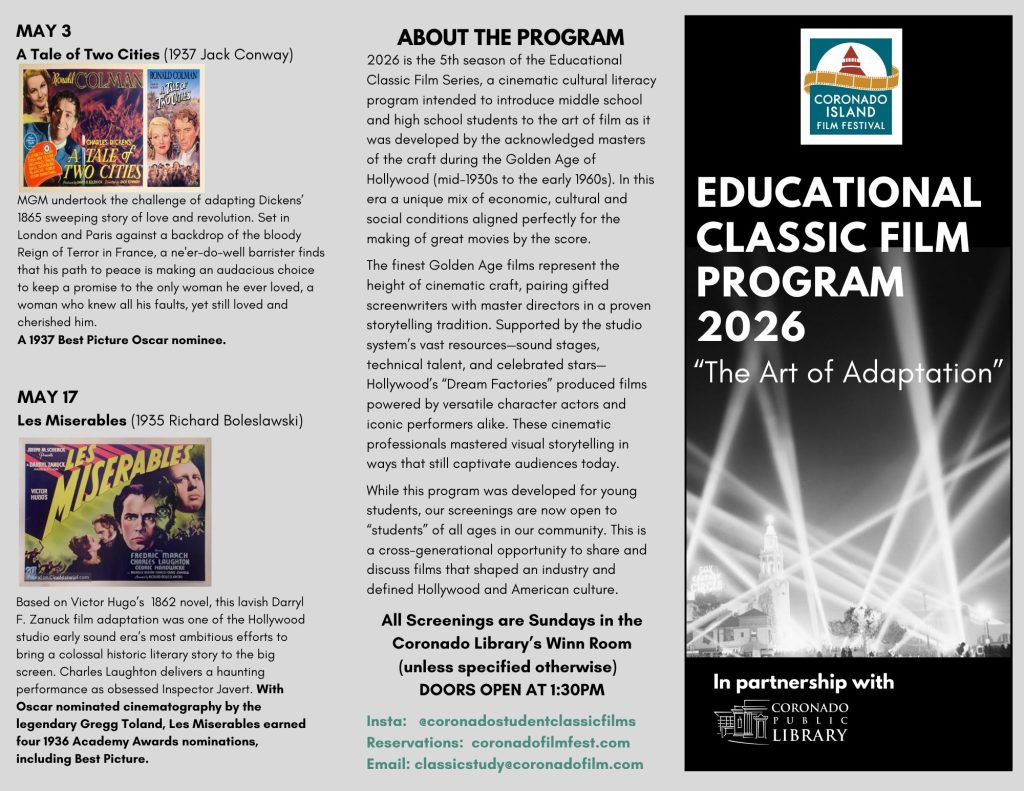 Now in its fifth season, the Educational Classic Film Program (formerly known as the Student Classic Series*) is a cinematic literacy program that introduces students of all ages and the broader community to the art of filmmaking through masterworks of Hollywood’s Golden Age (mid-1930s to early 1960s). *New this year, CIFF has expanded the program beyond school-age students to welcome the entire community of cinephiles.