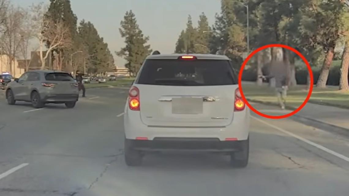 In the video, officers appear to pursue Baima as he runs south toward Exposition Boulevard. He is shown running across the street, first across westbound Exposition Boulevard, then across eastbound traffic. Two officers chase Baima with their guns drawn as he approaches a sidewalk. Two more officers then join the pursuit.