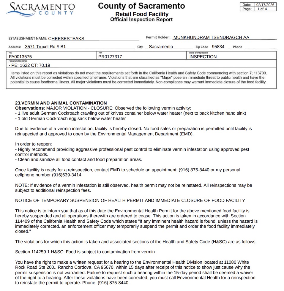 According to the report, Cheesesteaks’ health permit was suspended after it was asked to shut down by the Sacramento health department. The restaurant can request the department for a reinspection once they have corrected all the violations.