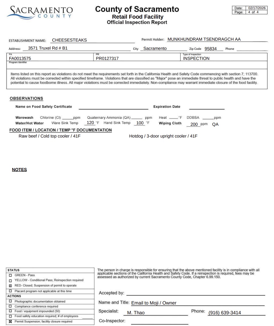 On February 17, the Sacramento health department conducted a routine check at Cheesesteaks. The restaurant was flagged for several health code violations, which resulted in its temporary closure.