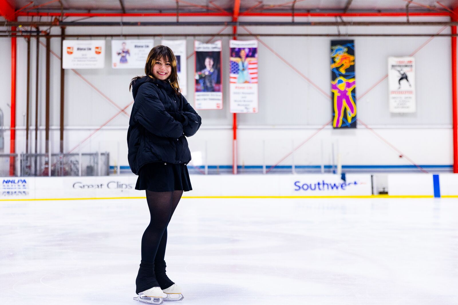 Alysa Liu poses for a portrait in May 2025 on her home ice at Oakland Ice Center in front of multiple banner commemorating her figure skating achievements. Credit: Estefany Gonzalez for The Oaklandside