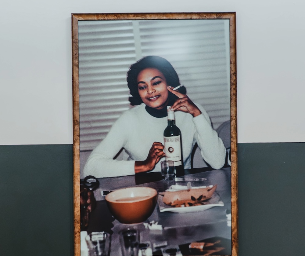 An old photo hanging in Good Neighbor's dining area showing a smiling woman