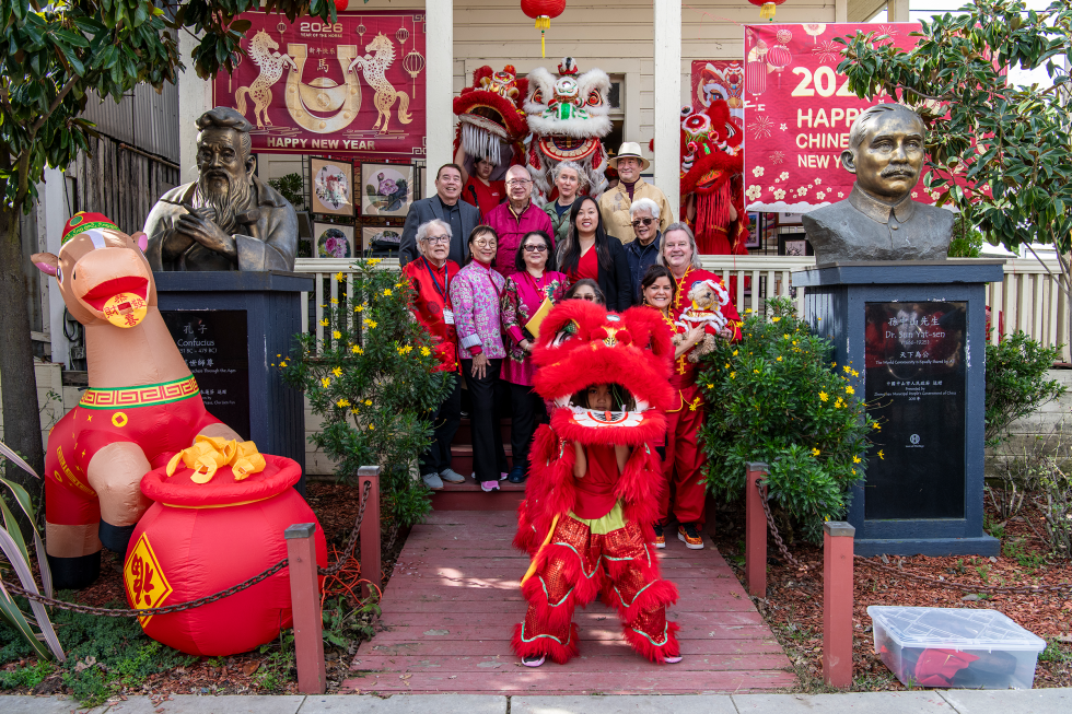 Museum flanked with busts of Confucius and Sun Yat-Sen. Scattered