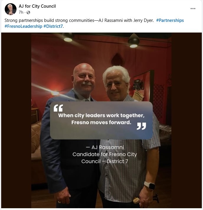 “The caption stated a simple truth: When city leaders work together, Fresno moves forward. That principle remains valid regardless of campaign season. Cooperation should not be controversial; it should be expected,” Rassamni said.