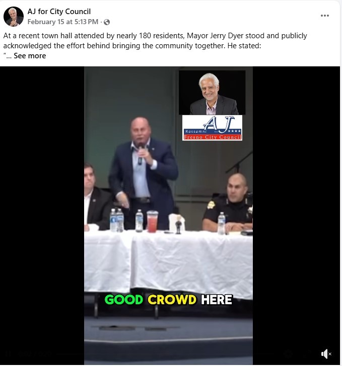 The Fresno City Council candidate posted a video on Facebook from “a recent town hall” where Mayor Jerry Dyer praised Rassamni.