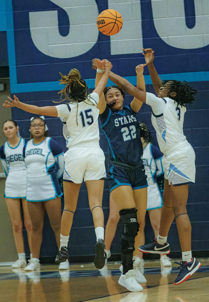 Oakland’s pressure from Makenya Sibert and Zariyah Benford forces Siegel’s Kassidy Kilbourne to get rid of the ball during their District 10-4A game at Siegel on Saturday, Feb. 21. JIM DAVIS