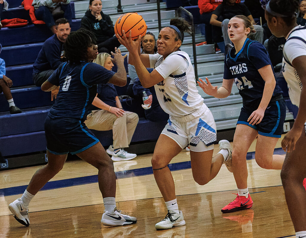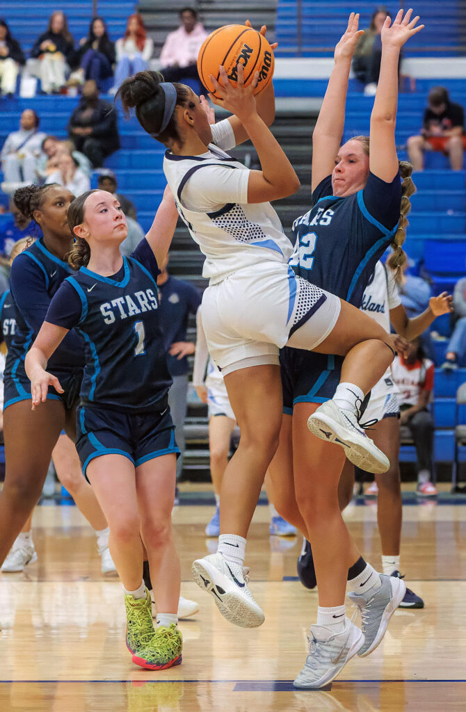 Oakland’s KK Richardson splits the defense of Seigel’s Indyah McDuffey and Aubrey Carroll to score an easy layup during their District 10-4A game at Siegel on Saturday, Feb. 21. JIM DAVIS