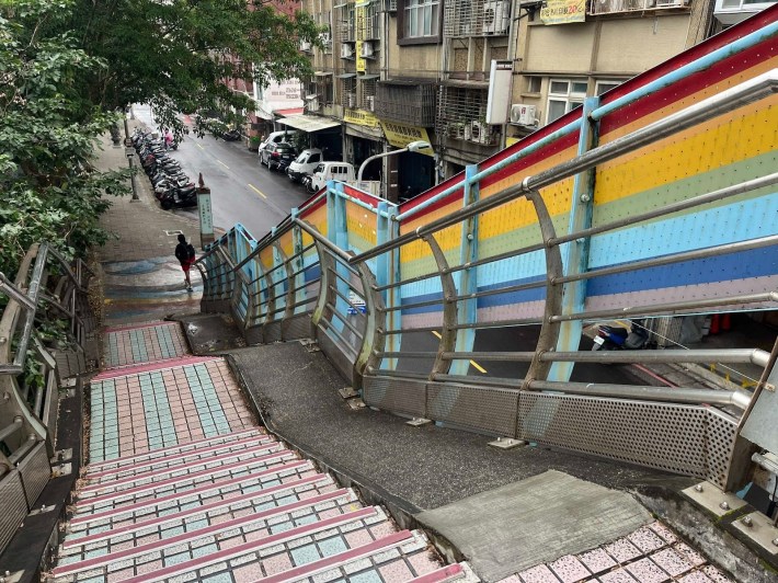 Pedestrian stairs and bike ramp on Taipei’s Rainbow Bridge.