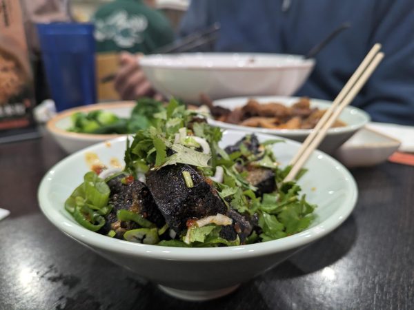 These noodles are not for the faint of heart or beginners to spice. They can, and do, make customers sweat and cry. The extreme level of spice is authentic to Hunan cuisine and makes it a challenge even for those accustomed to spice. Luckily, the meat and spice arrive in a separate bowl from the noodles and broth. This arrangement allows people to adjust the spice to their liking and drink a carefully perfected mix of oil, salt and spice in the chicken broth. Though it is overly intensified by the immense spice, the noodle experience is ultimately elevated by the spice mix. due to the strong and high-quality peppers used to make the pepper oil. The soup itself uses a traditional chicken broth, which gives the bowl of noodles a strong, perfectly salted and savory base. An addictive spice that burns your mouth is added alongside the dish, making it a perfect challenge that will keep you coming back for more. The noodles have a satisfying bounce to them, and the meat absorbs the savoriness of the soup while sharing the flavor of the spice. Serving sizes are also far too large to finish for a single person, providing a lot of food for the price. Sadly, the dish does not come with vegetables — they must be added on the side. Still, it provides a fulfilling experience to even those who are veterans with spice.