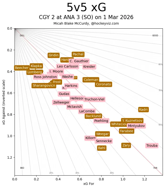 In The Crease – It is a darned shame the Flames finally get two goaltenders  both performing at a high level and they can never score enough to even keep themselves remotely in charge. In this one Devin Cooley stood on his head allowing just one 5v5 goal against on 3.27 expected goals. One extra goal and it’s a regulation loss again, but Cooley just continues to show he’s got what it takes to drag things farther than they should be allowed to go. An excellent tandem, no matter who gets the call. They know they need to steal every game too and it still doesn’t phase them – incredible mental fortitude in the Flames crease.
