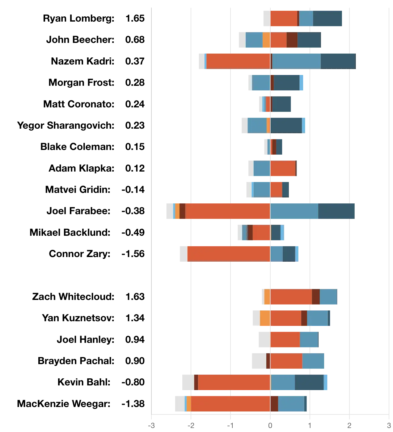 xGF% – Ryan Lomberg (64.58 per cent) with a great pass to set up the Flames first goal. He’s expressing his love for Calgary and wanting to stay lately. Unless an offer becomes something too overwhelmingly useful to say not to I have no quarrels with keeping him for another few years. He gets the crowd going, he gets the locker room going, and he’s not a detriment to the team’s defence when he’s out there. Does the simple things right to be able to go out and play his fourth line energy role to perfection. Not a lot of guys fill the shoes he wears, I’m fine if they let him keep on wearing them. At this point of the season nothing they do is going to change the direction too much. The goaltenders won’t let them lose too many but the lack of goals will prevent the wins from