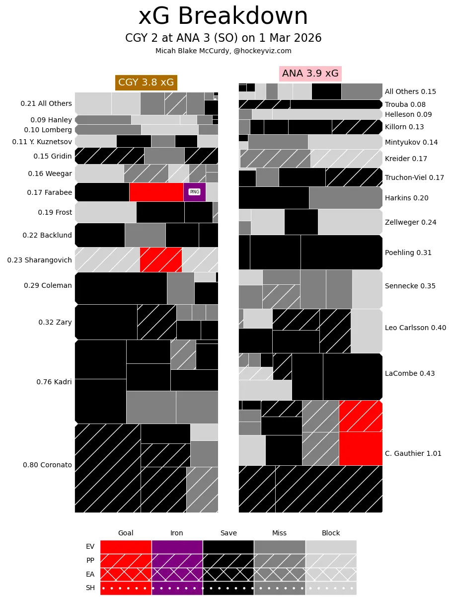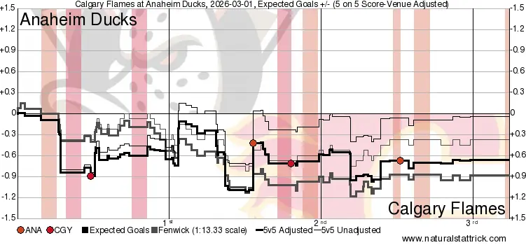 It’s a Team Game – The Flames played yet another strong, team game coming out of the Olympic break. They got into a bit of a track meet early against a young, speedy Ducks squad and were able to not just keep pace – do a little better than they did. If it weren’t for two quality goaltending performances there are a lot more goals scored in this game. However, their main struggle persisted in that of struggling to find that elusive “next goal”. Too many games where they just did not have enough guys able to pull the trigger. Goaltending continues to be their strength – keeping them in many fights – but it has just not been enough offence to remain competitive.