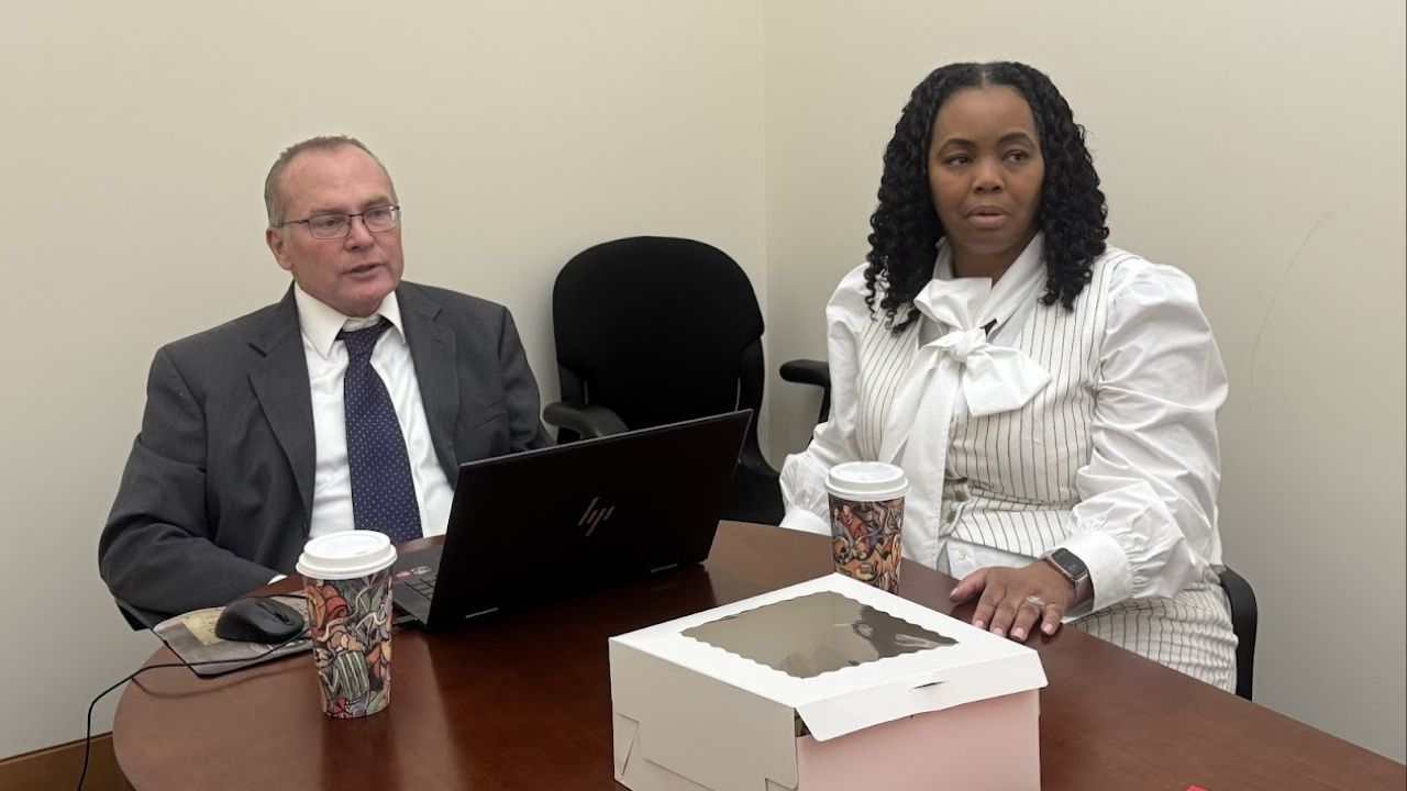 La-Kebbia “Kiki” Wilson (right) consults with her attorney Gary Goyette during a break in testimony, Tuesday, March 3, 2026. Wilson is suing the city of Fresno for racial discrimination. (GV Wire/David Taub)