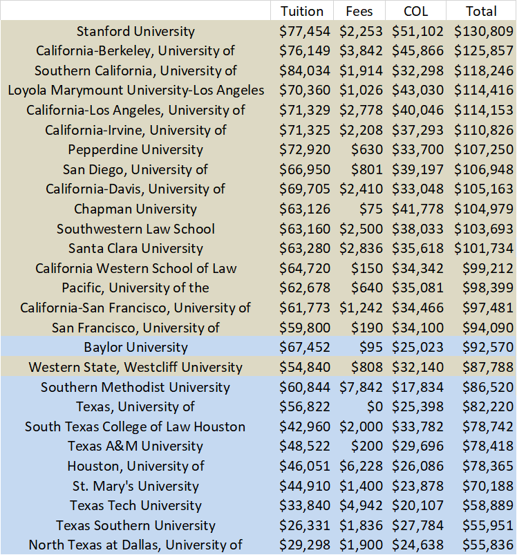 One more metric to observe: total cost of attendance. (Data drawn from ABA data, but some schools reported “$0” in some categories, and I went to verify data on websites before backfilling figures. I used full-time enrollment figures. South Texas’s cost of living in the ABA appears to be in error as it exceeds Stanford’s cost, so I updated that, too.)